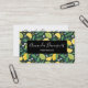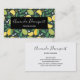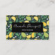 Business cards with a pretty pattern featuring yellow lemons and green lime fruit with stalks of leaves set on a dark green background.