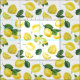 Fabric with a cute pattern of yellow lemons with green leaves and fresh cut lemon slices.