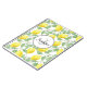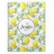 A spiral notebook personalized with a monogram initial and name inside a white circle with a black rope border. Designed with yellow lemons and green leaves, in a repeating pattern.