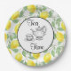 A paper plate designed with yellow lemons and green leaves, in a repeating pattern. In the centre is a white circle with a tea cup and kettle with the words: Tea Time.
