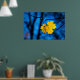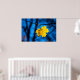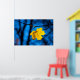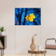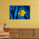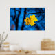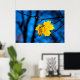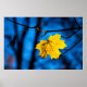 Image of a single yellow maple leaf on a twig against the dark blue background. One-of-a-kind poster to decorate a wall of a home or an office.