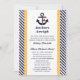 Yellow and navy blue anchor wedding invitations with a nautical theme. Navy and white striped border with a printed yellow stitched ribbon look design and an anchor with a star and red heart hanging off a rope. This cute and preppy design is perfect for an ocean or beach themed spring or summer wedding. Customize the front and back of this card to say whatever you want. Artwork © Chrissy H. Studios, LLC. All Rights Reserved.