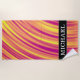 This beach towel design features a pattern that resembles curved ripples in water, coloured various shades of colours like yellow, orange and purple. It also features a custom name in white coloured text within a dark coloured area on the front. [~Z0000000]