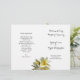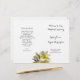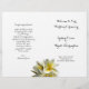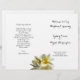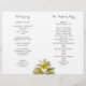 Folded wedding program with yellow plumeria flowers design. Ecru colour with black text templates on four pages - when folded. Text is printed on both sides of this 8.5 x 11 inch paper, with optional upgrades, to create one folded program per sheet. The front page has the title, full names of the couple, and a place for date, time and location of celebration. Include a paragraph to thank family and friends which will appear on the back of the program. Flip the paper over and create two columns of text for “the ceremony” or “order of ceremony”, and list “the wedding party”.