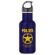 Yellow police star personalized kid's water bottle. Cute accessory for children who like to play cops and robbers. Perfect for future police officer, cadet, agent, sheriff, security guard, patrol officer, constable etc. Create one for son, grandson, granddaughter, nephew, play friends etc. Fun law enforcement theme Birthday presents for small boys and girls.