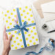 A wrapping paper built with a yellow polka dot pattern with a medium distance between the dots on a white background. Customize the white background among other options.