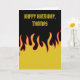 This greeting card is ready to be personalized with your own custom message on the front and on the inside so that you can make a "hot" card for any occasion. It features illustrations of flames in yellow and red set against a black background with your message in yellow on the front and on black on the inside.