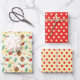 Cute and colourful 3-sheet set of Christmas holiday wrapping paper holly and red berries with pine cones on a yellow background. Sheets 2 and 3 have matching yellow and red polka dots.