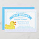 Cute Yellow Duck Baby shower invitations with a blue rain drops background. Rubber Ducky is in bubbles like he would be in the bath. Customize with your party details.