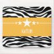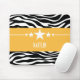 Trendy and modern Sassy Star Zebra Mousepad featuring a chic black and white zebra print background and a bold yellow border adorned with a fun star motif. This girly design may be customized with the personalized text of your choosing. Click "Customize It" to find more personalization options.