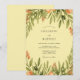 This design features a serene botanical arrangement set against a soft pale yellow backdrop. Lush olive branches with verdant leaves and small green fruits are positioned around the edges. Delicate peach-toned berries add a touch of warmth to the Mediterranean-inspired aesthetic. The watercolor style evokes a fresh, organic mood for a bright summer event.