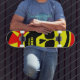 yellow skull with bones on red and black