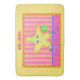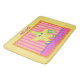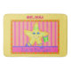 Have fun at the beach with this colourful orange and yellow bath mat rug personalized with a name to remind you of the beach. Great for a kids room or a beach house. This art is great for both kids and adults in a whimsy art style. The whimsy starfish is yellow and is on a pink and orange stripe background and is surrounded by orange boeder with dots. The starfish has a smiling face and is wearing purple shoes and is holding a green bucket pail. The bottom border has the words "Fun in the Sun". The background around the art is yellow. This makes a great gift for a beach lover and is great for a beach home. This is created with original art by Phyllis Dobbs and is vibrant in the yellow, orange, and hot pink colours. Fully customizable for your enjoyment.
