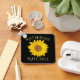 A close-up photograph of a single bright yellow sunflower and templates for first and last name on black background.