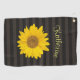 A close-up photograph of beautiful bright yellow sunflower with custom name on a dark brown and almost black striped background. Personalize easily by editing the name.
