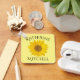 A close-up photograph of a single bright yellow sunflower and templates for first and last name on light yellow background.