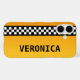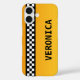 This yellow iPhone case features a white and black, taxi-cab-inspired, chequered stripe on the left side. The right side of the case features your own name or short message!