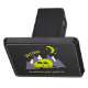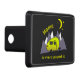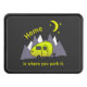 Camper themed hitch cover with inspirational slogan "Home is where you park it", which can be edited to your own words. Printed with an image of a yellow coloured teardrop style travel trailer against grey abstract mountains,  moon and stars. See more camping and caravan designs at Camp_and_Cottage on Zazzle.