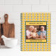 Personalize and add your own family photo. A yellow background decorated with a pattern of white chef hats.