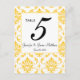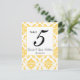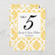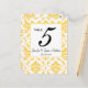 Table Number Cards with white and yellow damask and black accent colours. Layout Design by Elke Clarke©. Graphics licensed. Customize with your information and make one card with each number and add one card per number into our cart. Beautiful yellow and white damask background can be matched up with any colour by selecting "customize it" and then you can change the colour of the text, the frame line and the background box to match your wedding colour scheme.