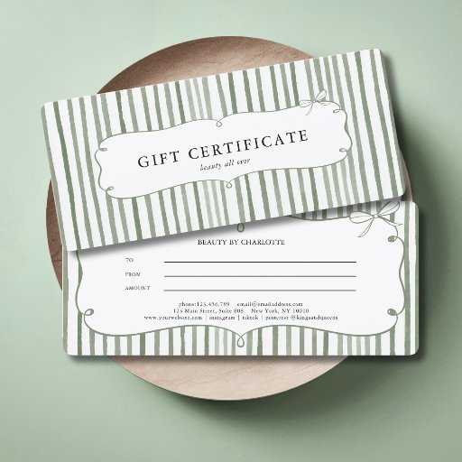 Add a feminine, on-trend touch to your branding with this elegant yellow and white striped gift certificate featuring a delicate coquette bow and ornamental frame design. The soft stripe pattern combined with the vintage-inspired ribbon bow detail creates a refined boutique aesthetic that feels romantic, stylish, and timeless.