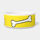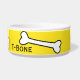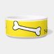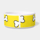 White ceramic dog food / water bowl, with yellow, around the outside. Graphics of cartoon bones, run around the outside of the bowl. Black custom text, on the front, is ready to personalize, for your pet or as a great gift idea for any pet owner. Matching pet products are available.