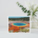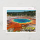 Stunning photographic postcard of the vividly colored Grand Prismatic Spring, featuring its deep blue center fading out to rings of bright orange, red, and yellow microbial mats, labeled "Yellowstone National Park." Captures the unique geothermal features of the Wyoming park. Ideal for geyser enthusiasts, Yellowstone visitors, and collectors of vibrant landscape photography.