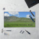 This Yellowstone National Park desk mat features just one of the many beautiful and varied landscapes of this huge National Park. The lush green grass fills the valley and is framed with the mountains topped with a cloud dotted blue sky. The green field provides the background for "Yellowstone National Park" which can be customized or deleted as you wish.