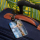 This luggage tag is shown with a photo print of a geyser in Yellowstone National Park.