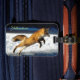 This luggage tag is shown with a photo print of a wild red fox in Yellowstone National Park.