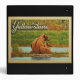 Vintage travel style Yellowstone National Park image featuring a brown bear and her cubs sitting at the edge of a river with green forest beyond.