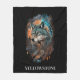This cozy fleece blanket is shown in a lovely Yellowstone wolf print on a black colour background.