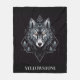 This cozy fleece blanket is shown in a lovely Yellowstone wolf print on a black colour background.