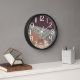 This wall clock has a mid-century modern abstract design of a blue line, a tan triangle, and a brown circle made of dots on a field of dark eggplant and cream. If you want the same design with different colours, message me.