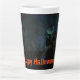 Cette éffrayante tasse Latte de chat noir est certainement effrayante. Cette tasse présente une scène d'Halloween avec une maison hantée, et un arrière - plan d'un chat noir attentif.