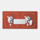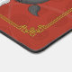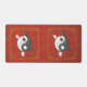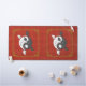 The dark Yin and light Yang the koi swim around one another creating a classic Chinese Taijitu, representing harmony and balance in all things. A classic Chinese border in gold frames the two fish, and a faint pattern of Chinese symbols for wealth, longevity, double happiness, and good fortune on a red background complete the design.