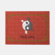 Le Yin foncé et la lumière Yang le koi nage l'un autour de l'autre créant un Taijitu chinois classique, représentant l'harmonie et l'équilibre en toutes choses. Une frontière chinoise classique en or encadre les deux poissons, et un motif faible de symboles chinois pour la richesse, la longévité, le double bonheur et la chance sur un arrière - plan rouge complète le design.
