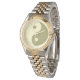 The watch is bright and shiny. It feels strong and durable. It is very appealing and attractive. The printed image appears clear. It is a perfect reminder for me to "Be Present" everywhere I go.