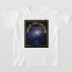 T-shirt white picture of a galaxy with earth and moon (inset) and "ABOVE AND BEYOND THE SPEED OF LIGHT" with Y-NOT-ME. In order to travel to other galaxies, we would have to have a ship that could travel many times the speed of light. We have nothing close to travelling that fast.