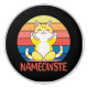 Colourful illustration with "Nameowste" text design and cute Kawaii cat is doing yoga on colourful striped retro background