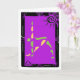 This color yoga greeting card was created from an original linocut print. It shows trikonasana or the triangle pose, which is a foundation pose in hatha yoga, in lime green and gold on a bright magenta background with a decorative border.