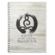Modern Yoga Studio Meditation Instructor / Life Coach / Healer / Reiki Master / Massage Therapy Notebook Template - Elegant Black and White Calligraphy Yoga Meditation Pose / Easy Pose / Sukhasana Pose with ZEN Symbol and Bodhi Leaf on Vintage White Wood Background.