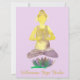 A new yoga business invitation decorated with a woman in a yoga lotus position with a lotus flower and water lily below illustrated in warm shades of yellow and purple watercolor with emerald green.