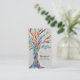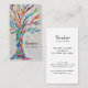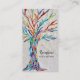 This unique business card is decorated with a Tree of Life design in rainbow colours on a pale grey background.