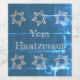 A distressed blue background sparkles behind white Stars of David. The text, Yom Haatzmaut, is in template format and can easily be changed using the personalize button.