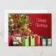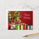Yorkie, or Yorkshire Terrier, hides among the Christmas presents hoping for a glimpse of Santa cute dog lovers Christmas holiday postcard