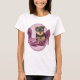 Cute yorkie puppy nesting in lilac polka dot stiletto, with light purple background, painted by artist Maryline Cazenave.