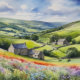 "Yorkshire Meadowsong". Landscape Yorkshire Dales. This stylized watercolour illustration of the Yorkshire Dales exudes tranquillity, with rolling hills and fields bordered by stone walls. Stone houses nestle the landscape, and vibrant meadow flowers provide a colourful contrast, embodying the peaceful, relaxed spirit of the countryside.