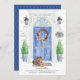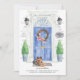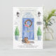 Annoncez votre nouvelle adresse avec notre faire-part élégante avec un Yorkshire Terrier, porte d'entrée bleue, tapis de bienvenue, ardoise, topiaires et une couronne fleurie sur un arrière - plan en brique grise.