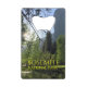 This credit card bottle opener shows a photograph of Yosemite National Park. Taken by my daughter-in-law, Brittany Mann, this gorgeous photograph shows the setting sun peeking through the trees, a lush green valley floor, and majestic mountains. At the bottom of this bottle opener are the words, "Yosemite National Park."